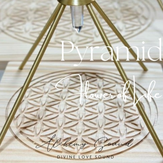 Flower of Life Energy Pyramid フラワー・オブ・ライフ クリスタルピラミッド 〜Sacred Geometry Energy Activator〜 組み立て式 サイズL 底辺一辺36cm 真ん中から頂点の長さ24.5cm 神聖幾何学「フラワー・オブ・ライフ」と黄金比に基づくピラミッド形状を組み合わせた、エネルギー調整&空間浄化ツール。 天頂に吊るされたクリスタルは、宇宙からの光と波動を集め、下に広がるフラワー・オブ・ライフ模様へと導きます。瞑想・ヒーリング・チャージング(パワーストーンや飲み水のエネルギー充填)に最適。お部屋の中心や祭壇に置くことで、空間全体に調和と活力をもたらします。住んでいる場所をパワースポットにしたり、波動水を作ったり食べ物や食べ物や天然石の浄化や活性化など日々の生活に永久的にご使用いただけます。 ピラミッドフレーム:安定した波動共鳴 クリスタルポイント:光のプリズムと浄化効果 フラワー・オブ・ライフ:創造と調和の象徴 用途:瞑想、空間浄化、エネルギーチャージ このピラミッドは、宇宙創造の青写真といわれる神聖幾何学「フラワー・オブ・ライフ」と、古代からパワースポットとして崇められてきたピラミッド形状を融合させた、高波動のエネルギーデバイスです。頂点に吊り下げられたクリスタルは、宇宙から降り注ぐ光と情報を受け取り、下に刻まれたフラワー・オブ・ライフを通してあらゆる方向へとエネルギーを放射します。瞑想時には心を深く静め、空間に置けば場を浄化し、持ち物やパワーストーン、水などの波動を高めます。 黄金比設計のピラミッド:宇宙の秩序と共鳴 クリスタルポイント:光のプリズムで波動を純化 フラワー・オブ・ライフ:生命エネルギーの活性化 瞑想、ヒーリング、空間調和、エネルギーチャージ あなたの空間と意識を、より高次の波動へと導くゲートウェイ。 神聖なひとときと、深い安らぎをお届けします。
